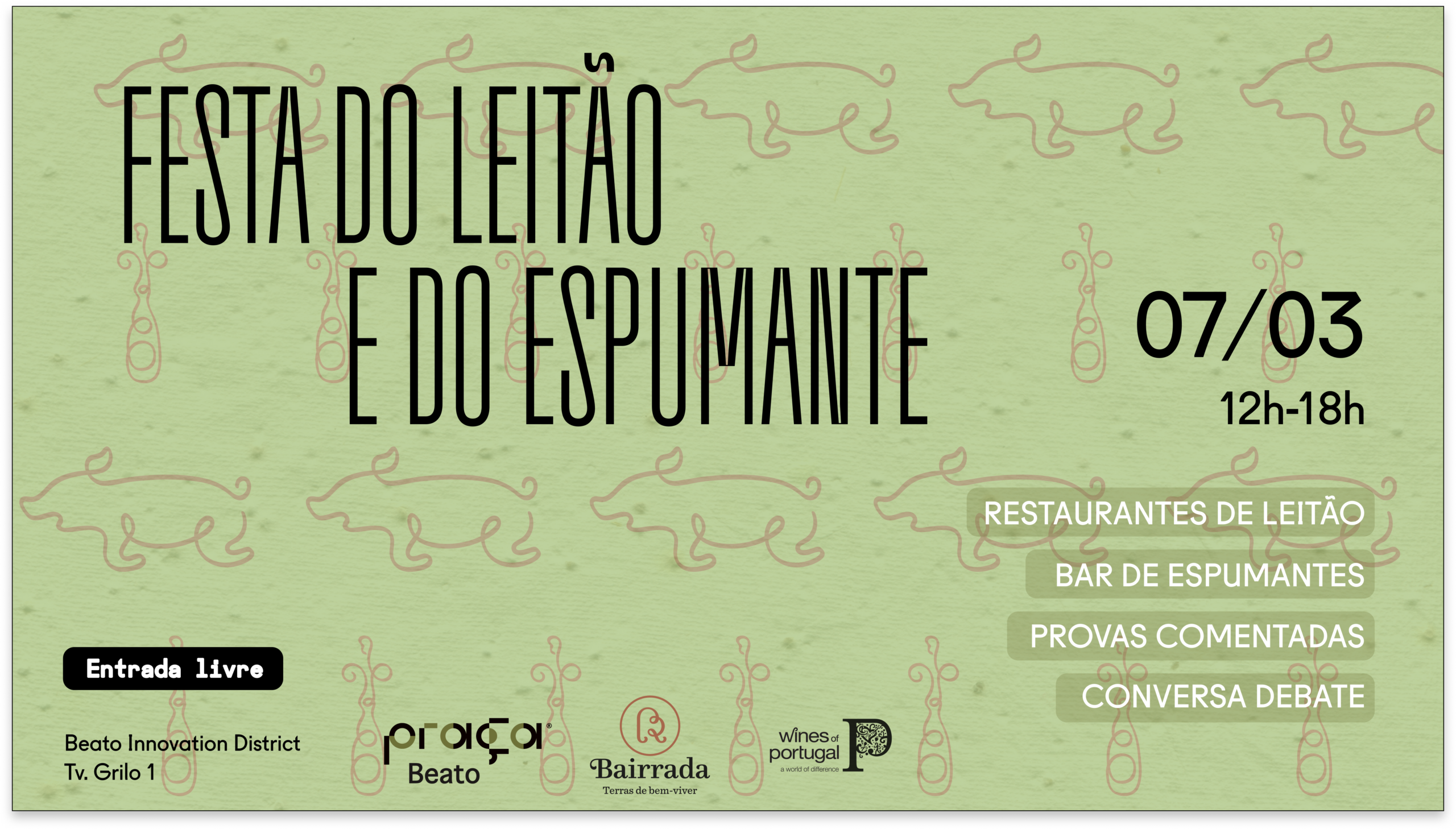 “Vamos lá arrancar a temporada das festas na Praça Beato com espumante e leitão da Bairrada! Ora, o que é que um maluquinho por leitão à Bairrada não dispensa na hora de levar à boca aquela pele dourada e crepitante com uma delicada camada de gordura e carne? Um espumante da Bairrada, pois claro. E o que é que faz falta a alguém que, numa das muitas caves da Bairrada, prova um ou outro estilo de espumante? Leitão, pois claro.”, comenta o crítico gastronómico e de vinhos Edgardo Pacheco, aqui no papel de curador da festa!